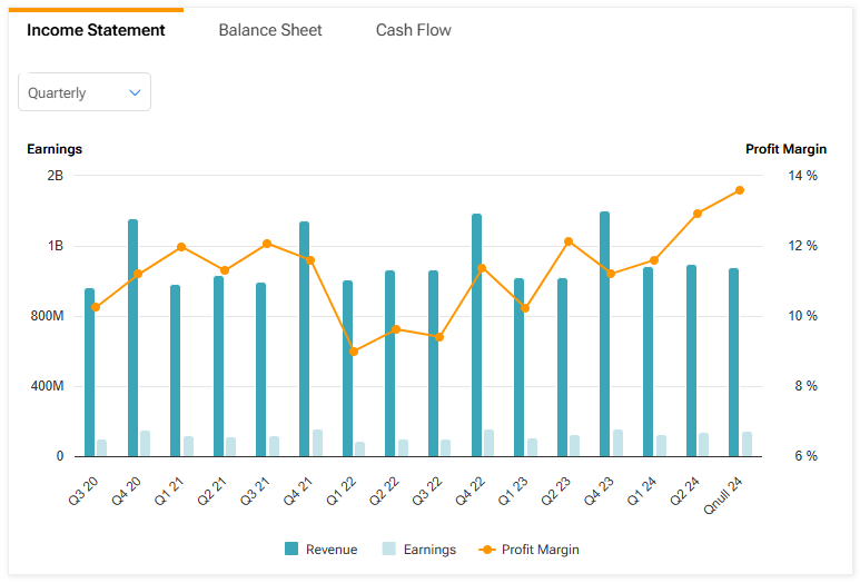 도미노 피자의 매출은 주로 피자 배달 및 프랜차이즈 수익에서 발생합니다. 2024년 3분기 매출은 10억 8천만 달러로 전년 동기 대비 5.14% 증가했습니다. 연간 기준으로는 46억 7천만 달러를 기록하며, 이는 전년 대비 4.41% 성장한 수치입니다. 그러나 미국 내 매출 성장률은 다소 주춤한 반면, 국제 매출은 계속해서 증가하고 있습니다.