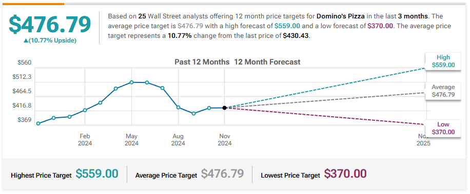 도미노 피자의 2024년 주가는 현재 $430.43에서 거래되고 있으며, 이는 연초 대비 약 5% 상승한 수치입니다. 전문가들은 도미노 피자의 주가가 $491.27까지 오를 것으로 전망하고 있습니다. 이는 디지털 배달 인프라와 국제 시장 확장 덕분에 향후 몇 년간 안정적인 성장이 기대되기 때문입니다.